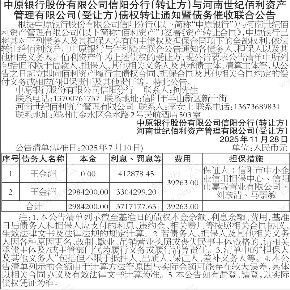 中原银行股份有限公司信阳分行与河南世纪佰利资产管理有限公司债权转让通知暨债务催收联合公告 银行转出