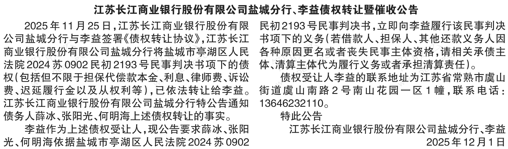 转让公告江苏长江商业银行股份有限公司盐城分行、李益债权转让暨催收公告 银行转出,江苏长江商业银行股份有限公司盐城分行、李益债权转让暨催收公告,公告日期:2025-12-01,转让方:江苏长江商业银行股份有限公司盐城分行,受让方:李益,资产总额:0.0万元。张阳光,薛冰,王月娥等5户。来源:江南时报 公告日期:2025-12-01债权金额债权本金户数5户联系方式李益李益13646232110