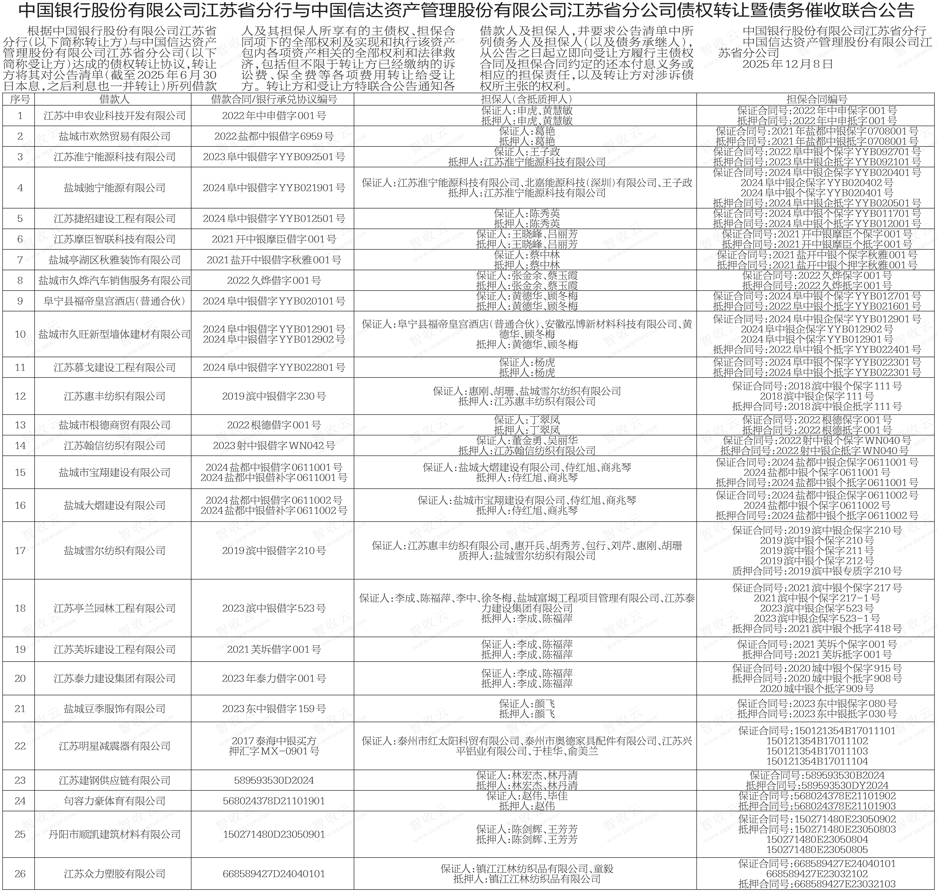 江苏明星减震器有限公司,江苏众力塑胶有限公司,中国银行股份有限公司江苏省分行与中国信达资产管理股份有限公司江苏省分公司债权转让暨债务催收联合公告,公告日期:2025-12-08,转让方:中国银行股份有限公司江苏省分行,受让方:中国信达资产管理股份有限公司江苏省分公司,资产总额:0.0万元。