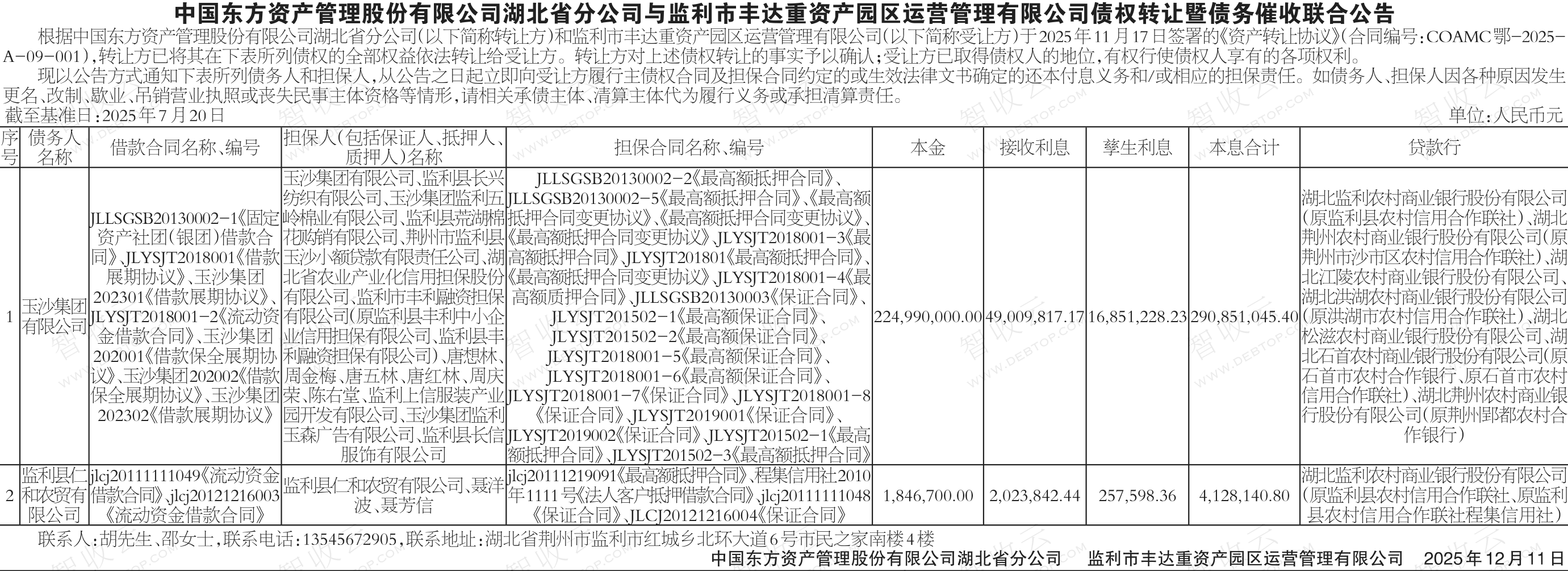 玉沙集团有限公司,监利县仁和农贸有限公司,中国东方资产管理股份有限公司湖北省分公司与监利市丰达重资产园区运营管理有限公司债权转让暨债务催收联合公告,公告日期:2025-12-11,转让方:中国东方资产管理股份有限公司湖北省分公司,受让方:监利市丰达重资产园区运营管理有限公司,资产总额:29497.9万元。