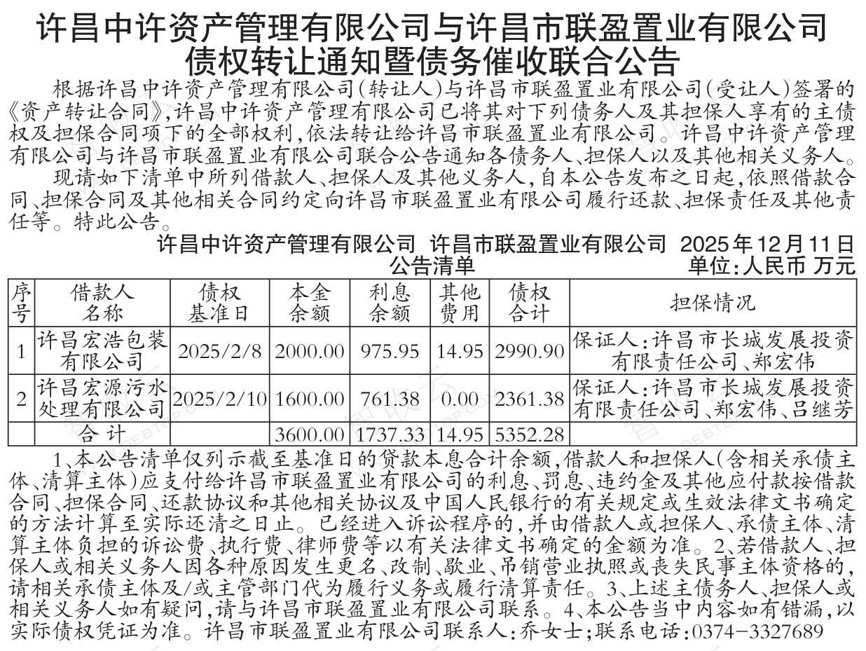 许昌宏源污水处理有限公司,许昌宏浩包装有限公司,许昌中许资产管理有限公司与许昌市联盈置业有限公司债权转让通知暨债务催收联合公告,公告日期:2025-12-11,转让方:许昌中许资产管理有限公司,受让方:许昌市联盈置业有限公司,资产总额:5352.3万元。