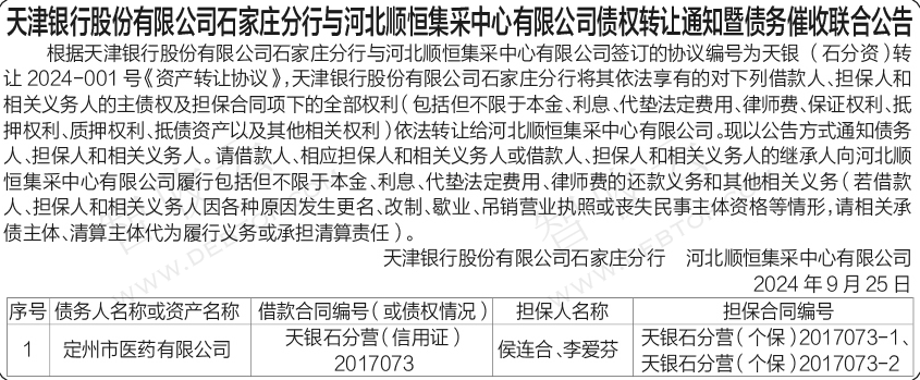 定州市医药有限公司,天津银行股份有限公司石家庄分行与河北顺恒集采中心有限公司债权转让通知暨债务催收联合公告,公告日期:2024-10-25,转让方:天津银行股份有限公司石家庄分行,受让方:河北顺恒集采中心有限公司,资产总额:0.0万元。