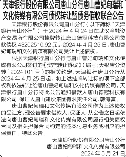 唐山德冠科技有限公司天津银行股份有限公司唐山分行唐山曹妃甸瑞和文化传媒有限公司债权转让暨债务催收联合公告 银行转出