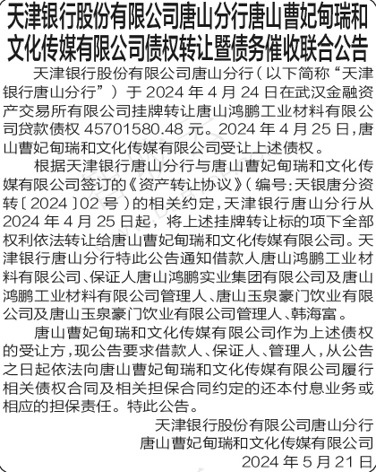 唐山鸿鹏工业材料有限公司,唐山玉泉豪门饮业有限公司,天津银行股份有限公司唐山分行唐山曹妃甸瑞和文化传媒有限公司债权转让暨债务催收联合公告,公告日期:2024-05-23,转让方:天津银行股份有限公司唐山分行,受让方:唐山曹妃甸瑞和文化传媒有限公司,资产总额:4570.2万元。