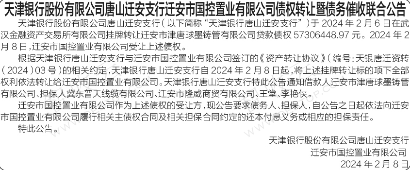 迁安市津唐球墨铸管有限公司,冀东普天线缆有限公司,天津银行股份有限公司唐山迁安支行迁安市国控置业有限公司债权转让暨债务催收联合公告,公告日期:2024-02-22,转让方:天津银行股份有限公司唐山迁安支行,受让方:迁安市国控置业有限公司,资产总额:5730.6万元。