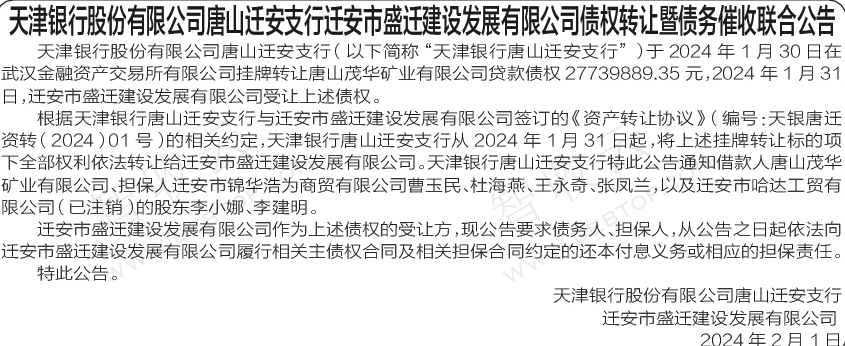 唐山茂华矿业有限公司天津银行股份有限公司唐山迁安支行迁安市盛迁建设发展有限公司债权转让暨债务催收联合公告 银行转出