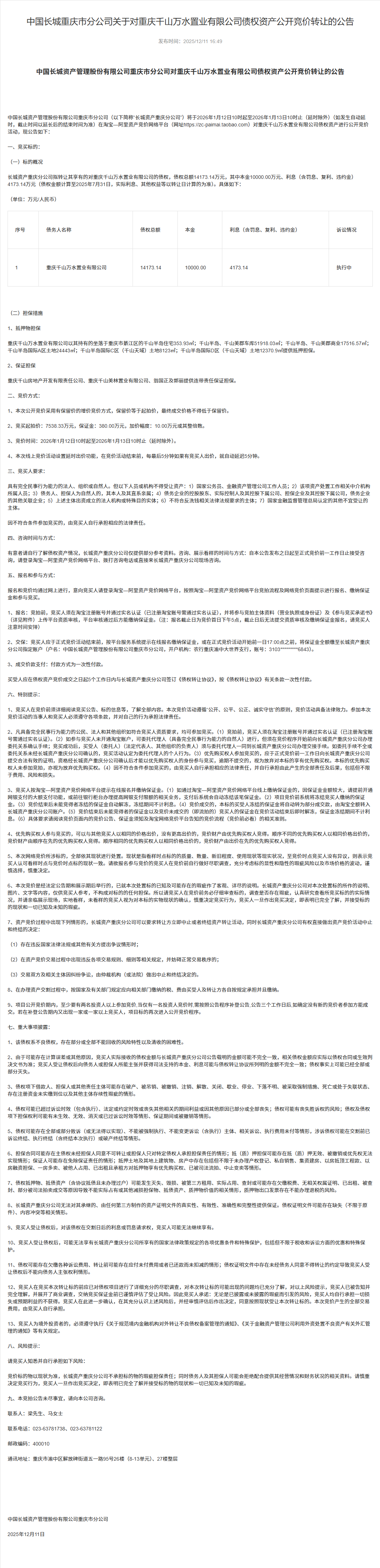 重庆千山万水置业有限公司,重庆千山房地产开发有限责任公司,中国长城重庆市分公司关于对重庆千山万水置业有限公司债权资产公开竞价转让的公告,公告日期:2025-12-11,债权方:中国长城资产管理股份有限公司重庆市分公司,资产总额:14173.1万元。