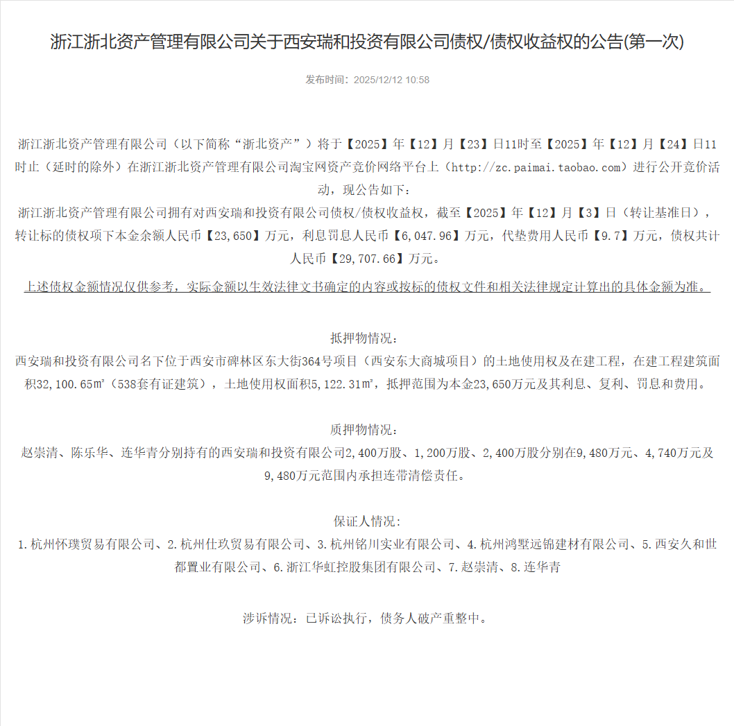 西安瑞和投资有限公司,杭州怀璞贸易有限公司,浙江浙北资产管理有限公司关于西安瑞和投资有限公司债权/债权收益权的公告(第一次),公告日期:2025-12-12,债权方:浙江浙北资产管理有限公司,资产总额:707.7万元。