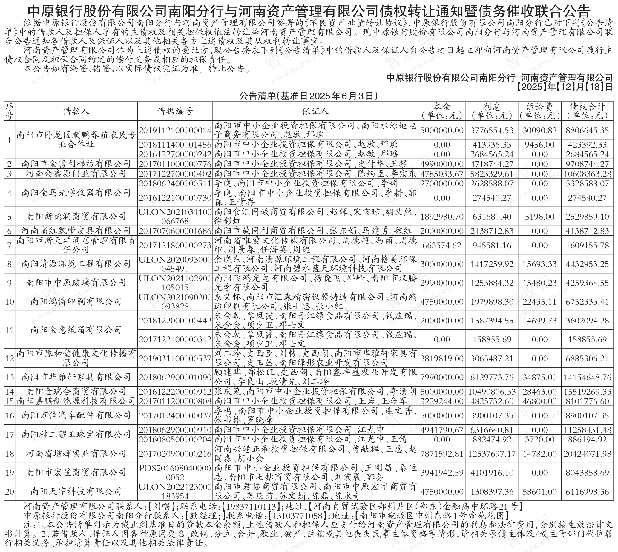 河南金鑫源门业有限公司,南阳嘉鹏新能源科技有限公司,中原银行股份有限公司南阳分行与河南资产管理有限公司债权转让通知暨债务催收联合公告,公告日期:2025-12-18,转让方:中原银行股份有限公司南阳分行,受让方:河南资产管理有限公司,资产总额:16560.9万元。