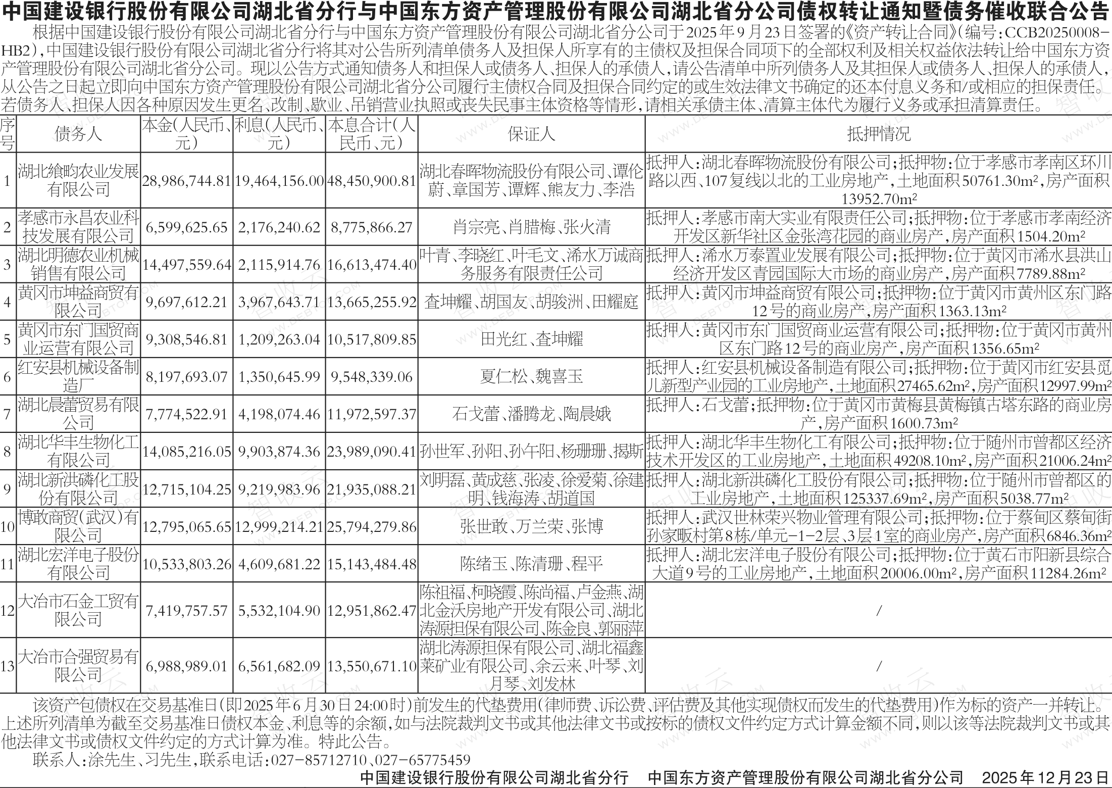 湖北华丰生物化工有限公司,孝感市永昌农业科技发展有限公司,中国建设银行股份有限公司湖北省分行与中国东方资产管理股份有限公司湖北省分公司债权转让通知暨债务催收联合公告,公告日期:2025-12-23,转让方:中国建设银行股份有限公司湖北省分行,受让方:中国东方资产管理股份有限公司湖北省分公司,资产总额:23290.9万元。