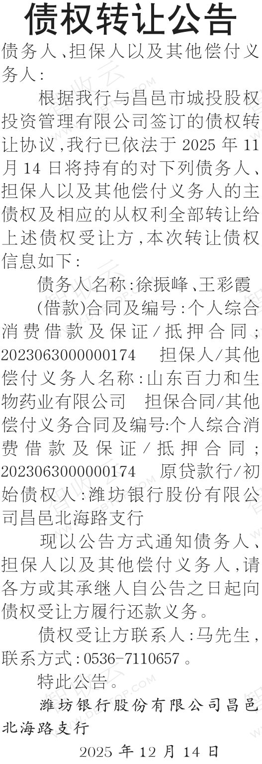 转让公告债权转让公告 银行转出山东百力和生物药业有限公司,债权转让公告,公告日期:2025-12-25,转让方:潍坊银行股份有限公司昌邑北海路支行,受让方:昌邑市城投股权投资管理有限公司,资产总额:0.0万元。徐振峰,王彩霞等2户。来源:山东法制报 公告日期:2025-12-25债权金额债权本金户数2户所涉债务企业山东百力和生物药业有限公司联系方式昌邑市城投股权投资管理有限公司马先生0536-7110657