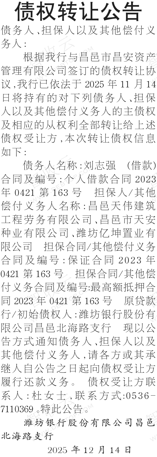 转让公告债权转让公告 银行转出昌邑天伟建筑工程劳务有限公司,昌邑市天安种业有限公司,债权转让公告,公告日期:2025-12-25,转让方:潍坊银行股份有限公司昌邑北海路支行,受让方:昌邑市昌安资产管理有限公司,资产总额:0.0万元。刘志强等1户。来源:山东法制报 公告日期:2025-12-25债权金额债权本金户数1户所涉债务企业昌邑天伟建筑工程劳务有限公司昌邑市天安种业有限公司潍坊亿坤置业有限公司联系方式昌邑市昌安资产管理有限公司杜女士0536-7110369