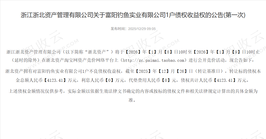 富阳钓鱼实业有限公司,浙江浙北资产管理有限公司关于富阳钓鱼实业有限公司1户债权收益权的公告(第一次),公告日期:2025-12-29,债权方:浙江浙北资产管理有限公司,资产总额:4123.4万元。