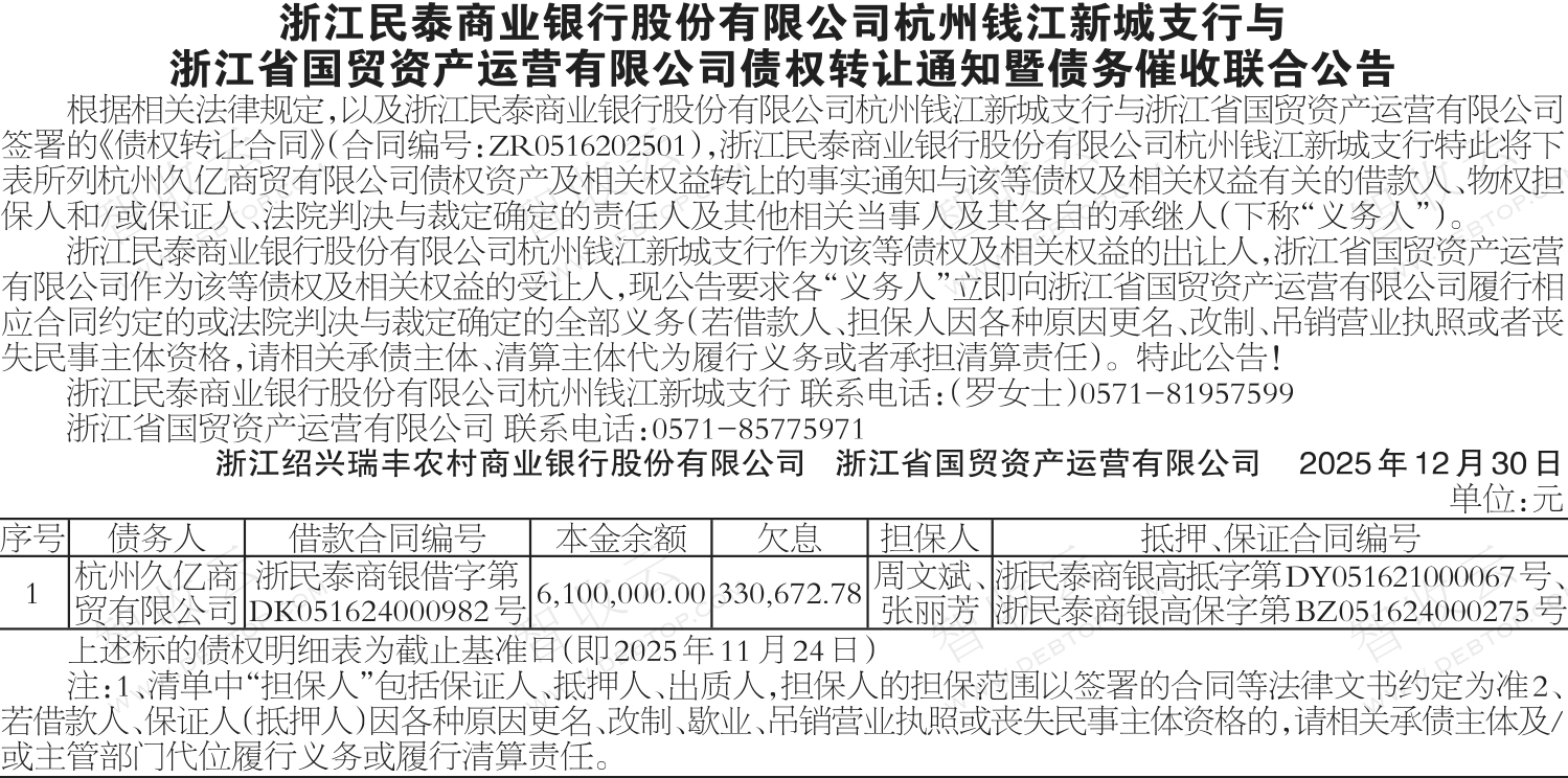 杭州久亿商贸有限公司,浙江民泰商业银行股份有限公司杭州钱江新城支行与浙江省国贸资产运营有限公司债权转让通知暨债务催收联合公告,公告日期:2025-12-30,转让方:浙江民泰商业银行股份有限公司杭州钱江新城支行,受让方:浙江省国贸资产运营有限公司,资产总额:643.1万元。