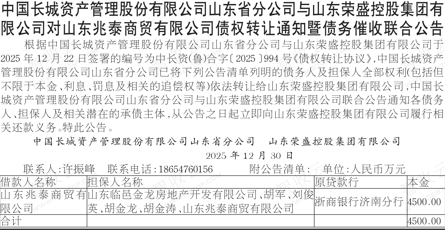 山东兆泰商贸有限公司,山东临邑金龙房地产开发有限公司,中国长城资产管理股份有限公司山东省分公司与山东荣盛控股集团有限公司对山东兆泰商贸有限公司债权转让通知暨债务催收联合公告,公告日期:2025-12-30,转让方:中国长城资产管理股份有限公司山东省分公司,受让方:山东荣盛控股集团有限公司,资产总额:4500.0万元。