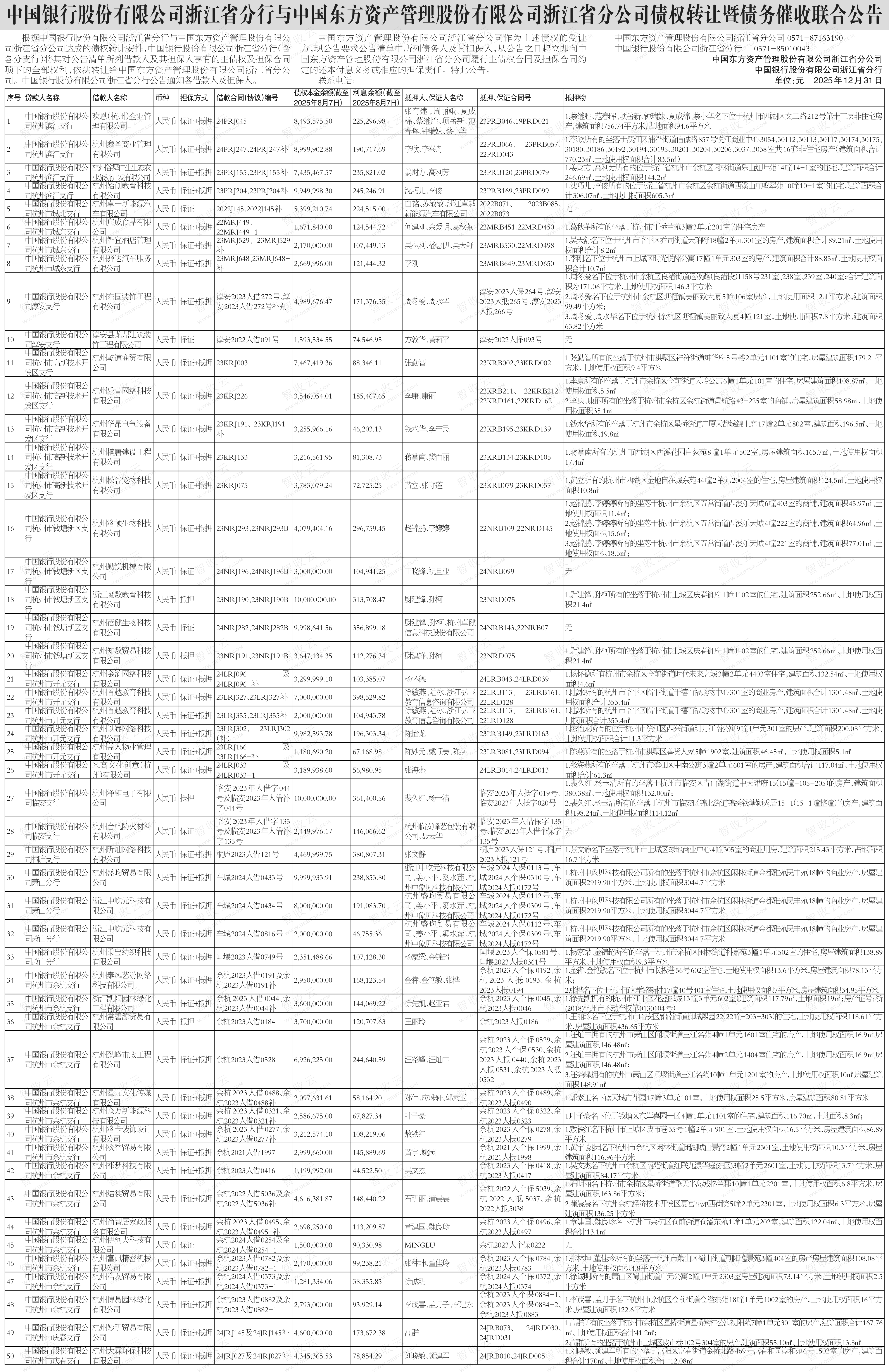 浙江魔数教育科技有限公司,杭州伊柯夫科技有限公司,中国银行股份有限公司浙江省分行与中国东方资产管理股份有限公司浙江省分公司债权转让暨债务催收联合公告,公告日期:2025-12-31,转让方:中国银行股份有限公司浙江省分行,受让方:中国东方资产管理股份有限公司浙江省分公司,资产总额:23258.6万元。