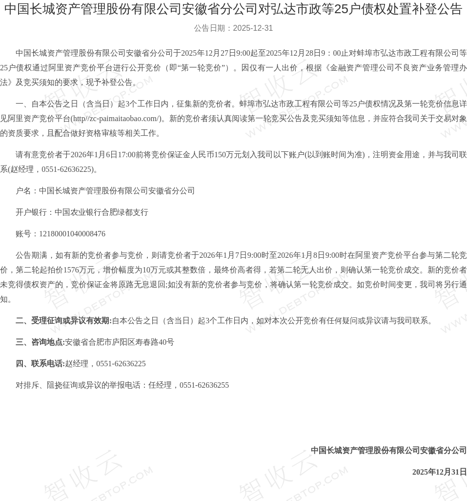 ,中国长城资产管理股份有限公司安徽省分公司对弘达市政等25户债权处置补登公告,公告日期:2025-12-31,债权方:中国长城资产管理股份有限公司安徽省分公司,资产总额:0.0万元。