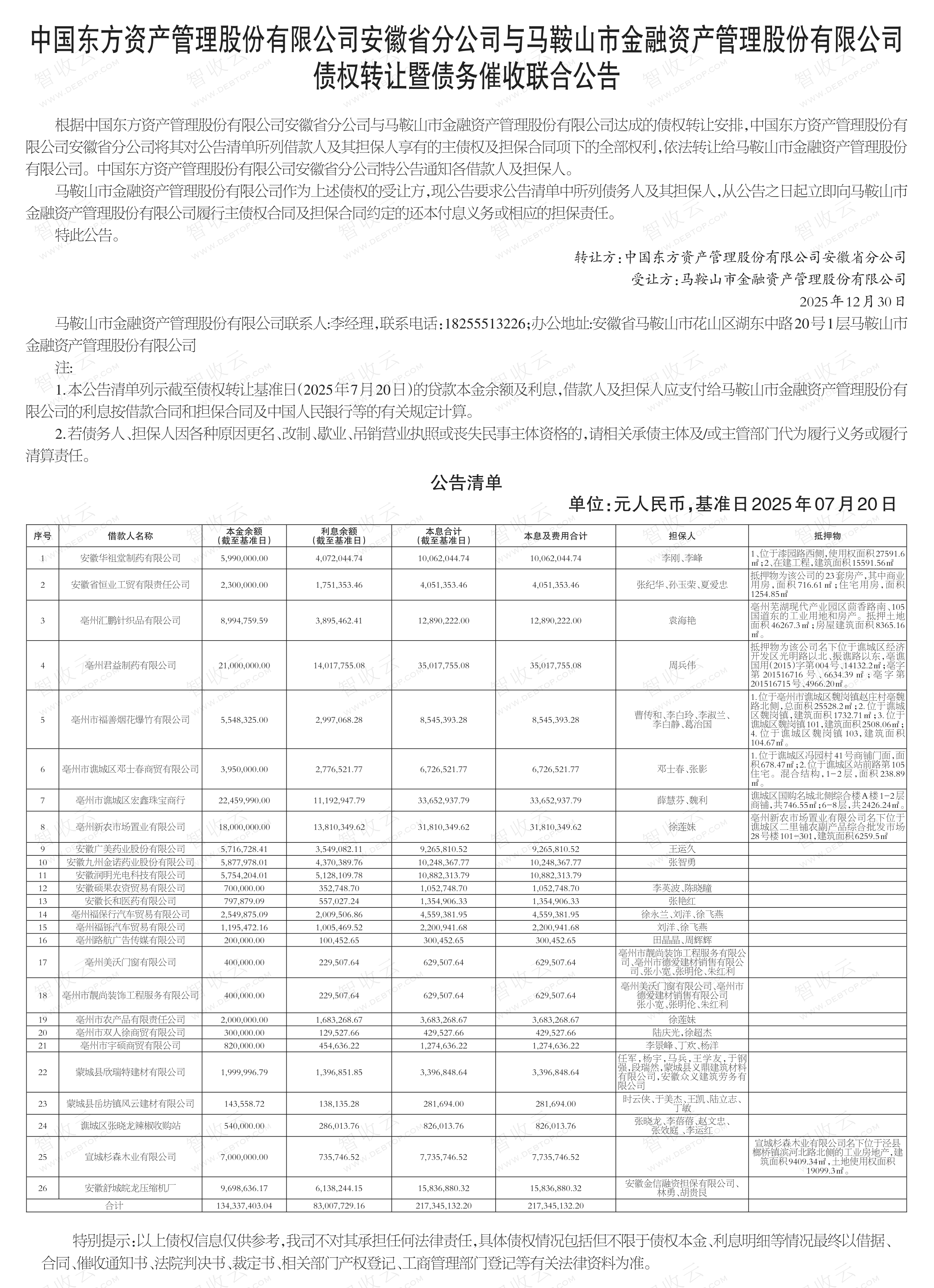 安徽华祖堂制药有限公司,安徽省恒业工贸有限责任公司,中国东方资产管理股份有限公司安徽省分公司与马鞍山市金融资产管理股份有限公司债权转让暨债务催收联合公告,公告日期:2025-12-31,转让方:中国东方资产管理股份有限公司安徽省分公司,受让方:马鞍山市金融资产管理股份有限公司,资产总额:21734.5万元。