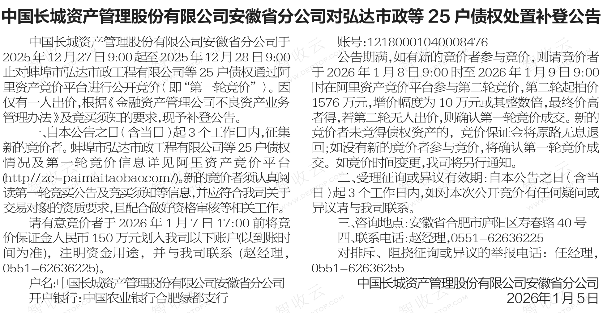 蚌埠市弘达市政工程有限公司,中国长城资产管理股份有限公司安徽省分公司对弘达市政等25户债权处置补登公告,公告日期:2026-01-05,债权方:中国长城资产管理股份有限公司安徽省分公司,资产总额:0.0万元。
