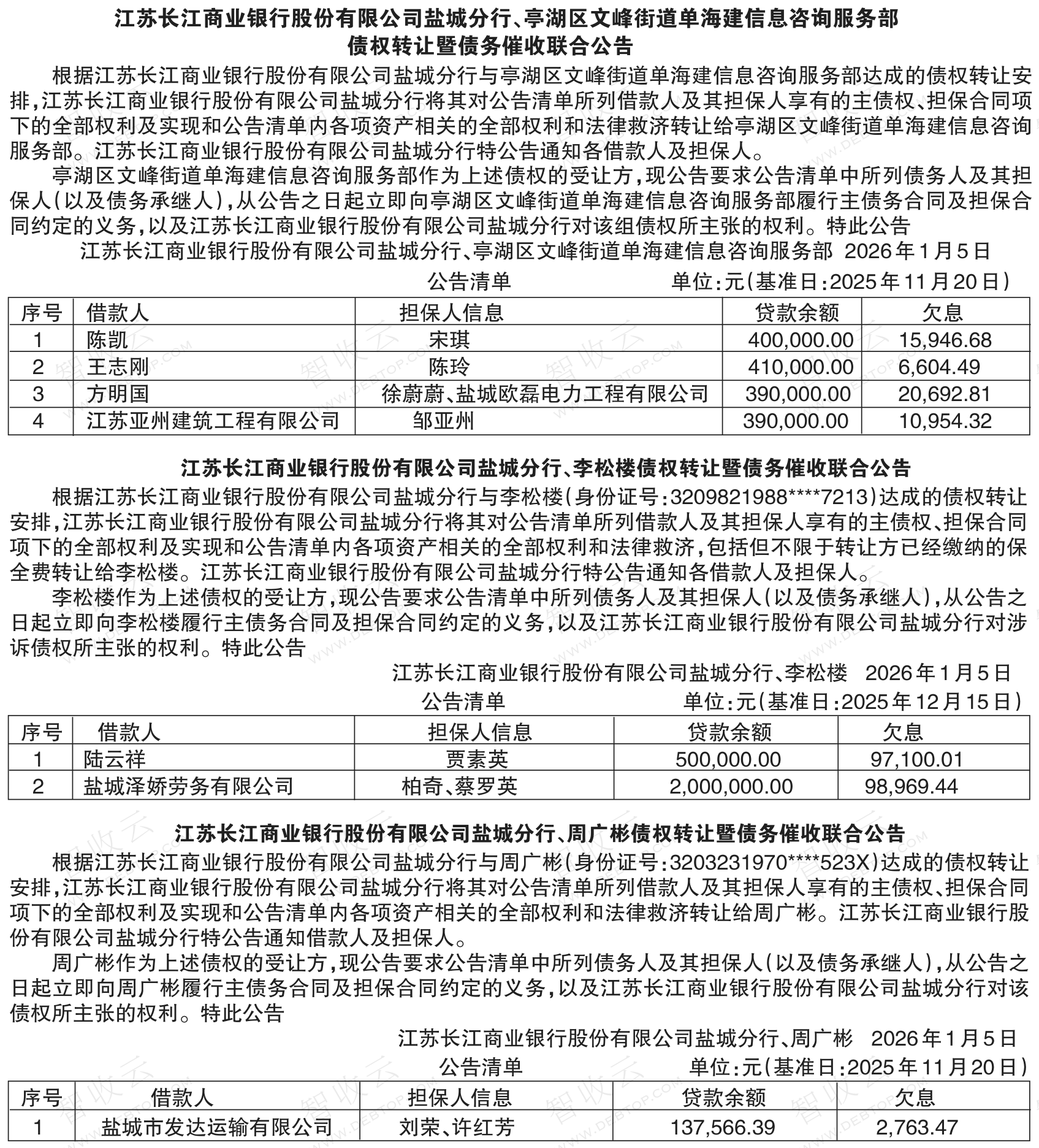 江苏亚州建筑工程有限公司,盐城泽娇劳务有限公司,江苏长江商业银行股份有限公司盐城分行、亭湖区文峰街道单海建信息咨询服务部债权转让暨债务催收联合公告,公告日期:2026-01-05,转让方:江苏长江商业银行股份有限公司盐城分行,受让方:亭湖区文峰街道单海建信息咨询服务部,李松楼,周广彬,资产总额:448.1万元。