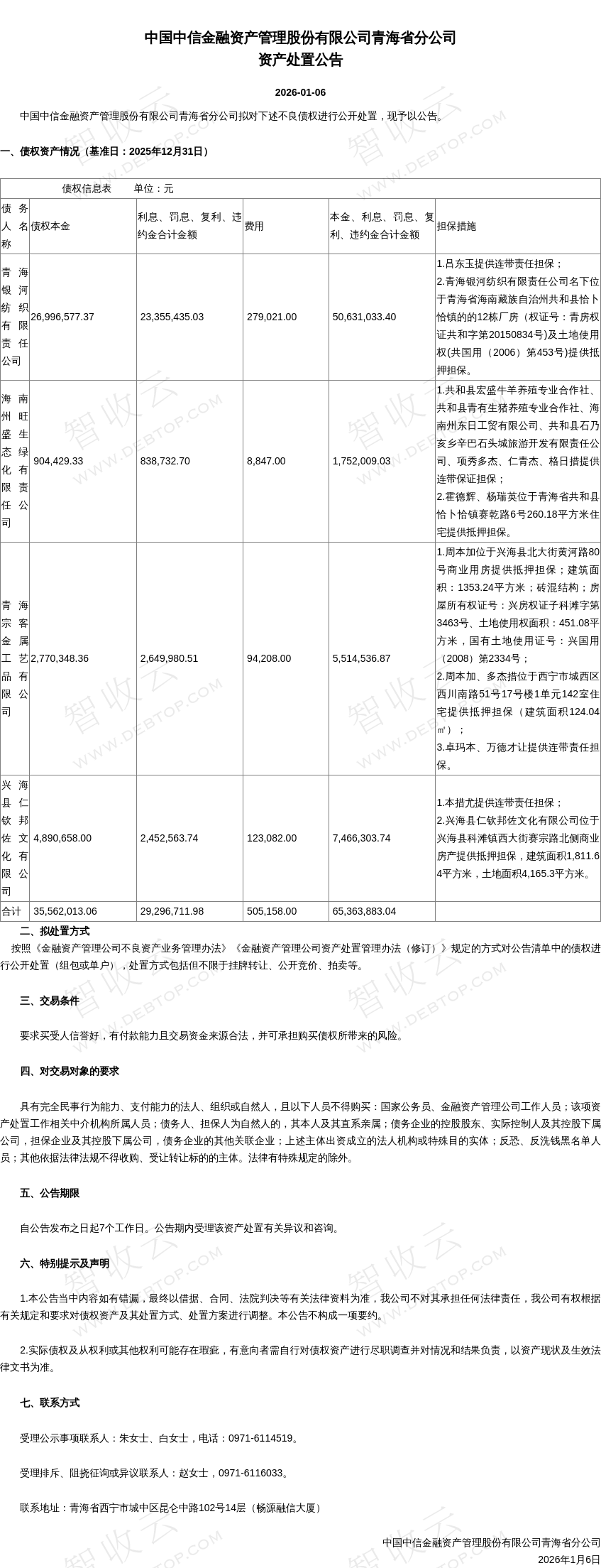 青海宗客金属工艺品有限公司,兴海县仁钦邦佐文化有限公司,中国中信金融资产管理股份有限公司青海省分公司资产处置公告,公告日期:2026-01-06,债权方:中国中信金融资产管理股份有限公司青海省分公司,资产总额:6586.9万元。