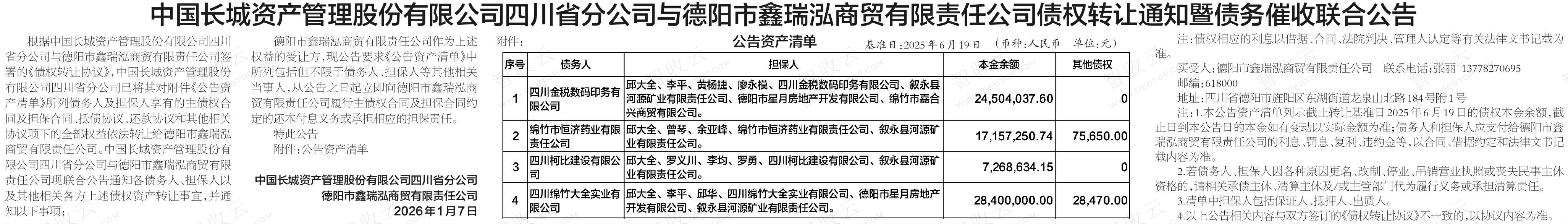 绵竹市恒济药业有限责任公司,四川金税数码印务有限公司,中国长城资产管理股份有限公司四川省分公司与德阳市鑫瑞泓商贸有限责任公司债权转让通知暨债务催收联合公告,公告日期:2026-01-07,转让方:中国长城资产管理股份有限公司四川省分公司,受让方:德阳市鑫瑞泓商贸有限责任公司,资产总额:7743.4万元。