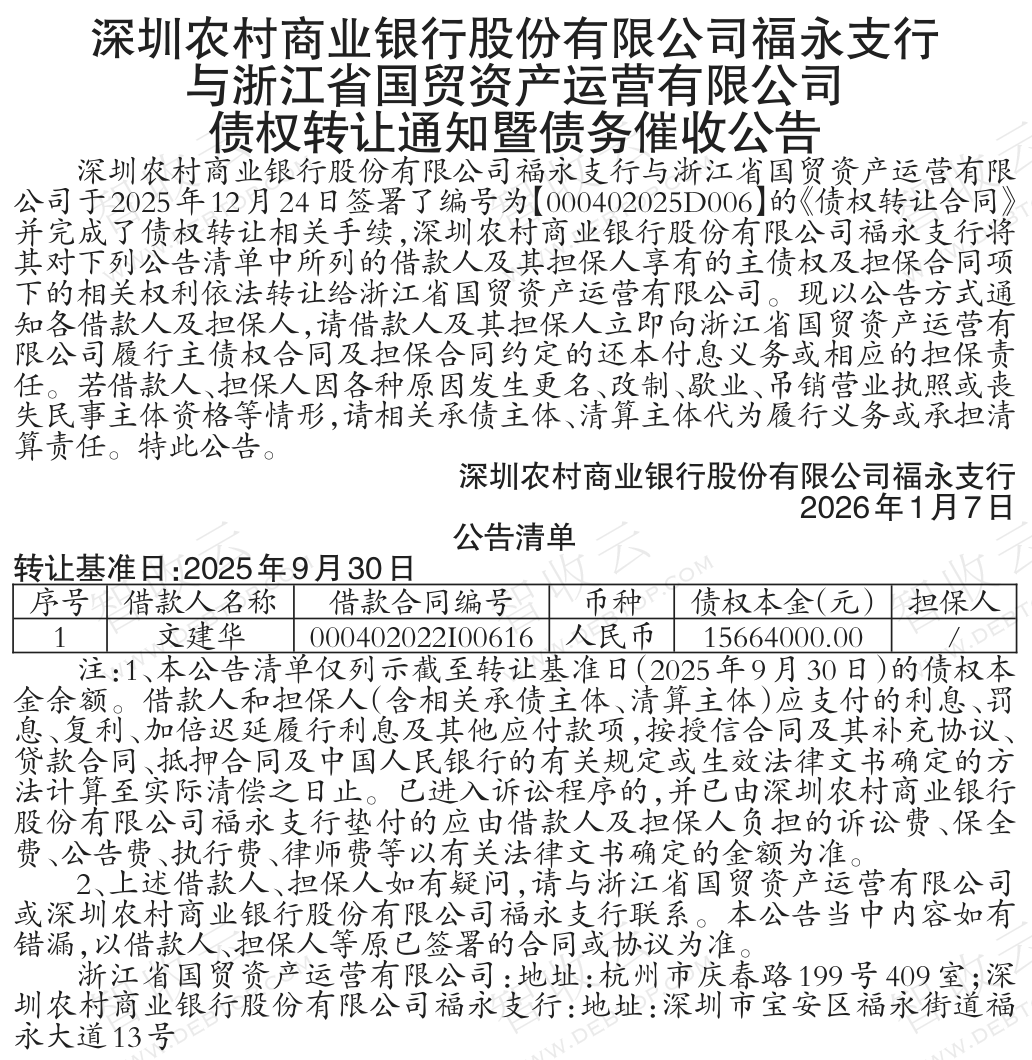 ,深圳农村商业银行股份有限公司福永支行与浙江省国贸资产运营有限公司债权转让通知暨债务催收公告,公告日期:2026-01-07,转让方:深圳农村商业银行股份有限公司福永支行,受让方:浙江省国贸资产运营有限公司,资产总额:1566.4万元。
