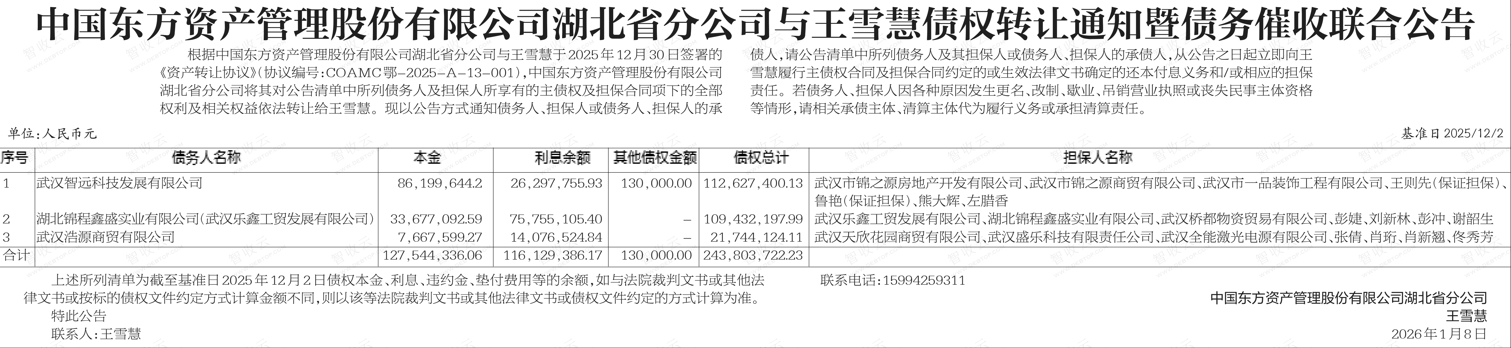 武汉智远科技发展有限公司,湖北锦程鑫盛实业有限公司,中国东方资产管理股份有限公司湖北省分公司与王雪慧债权转让通知暨债务催收联合公告,公告日期:2026-01-08,转让方:中国东方资产管理股份有限公司湖北省分公司,受让方:王雪慧,资产总额:24367.4万元。