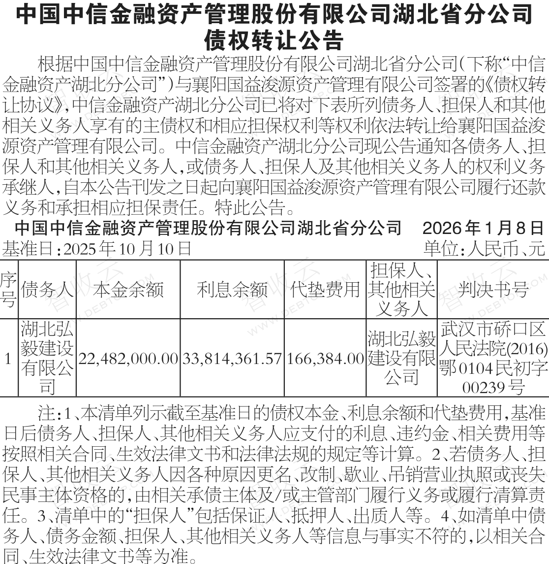 中国中信金融资产管理股份有限公司湖北省分公司债权转让公告 AMC转出
