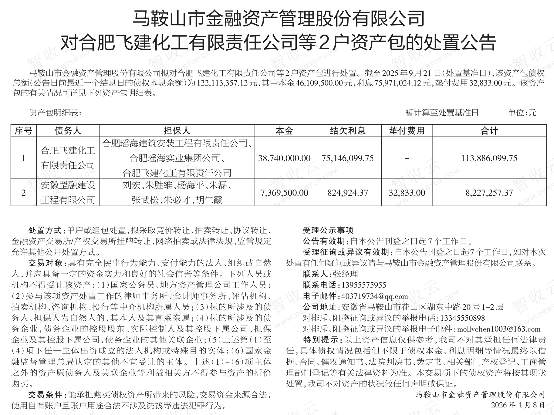 合肥飞建化工有限责任公司,安徽罡融建设工程有限公司,马鞍山市金融资产管理股份有限公司对合肥飞建化工有限责任公司等2户资产包的处置公告,公告日期:2026-01-08,债权方:马鞍山市金融资产管理股份有限公司,资产总额:12211.3万元。