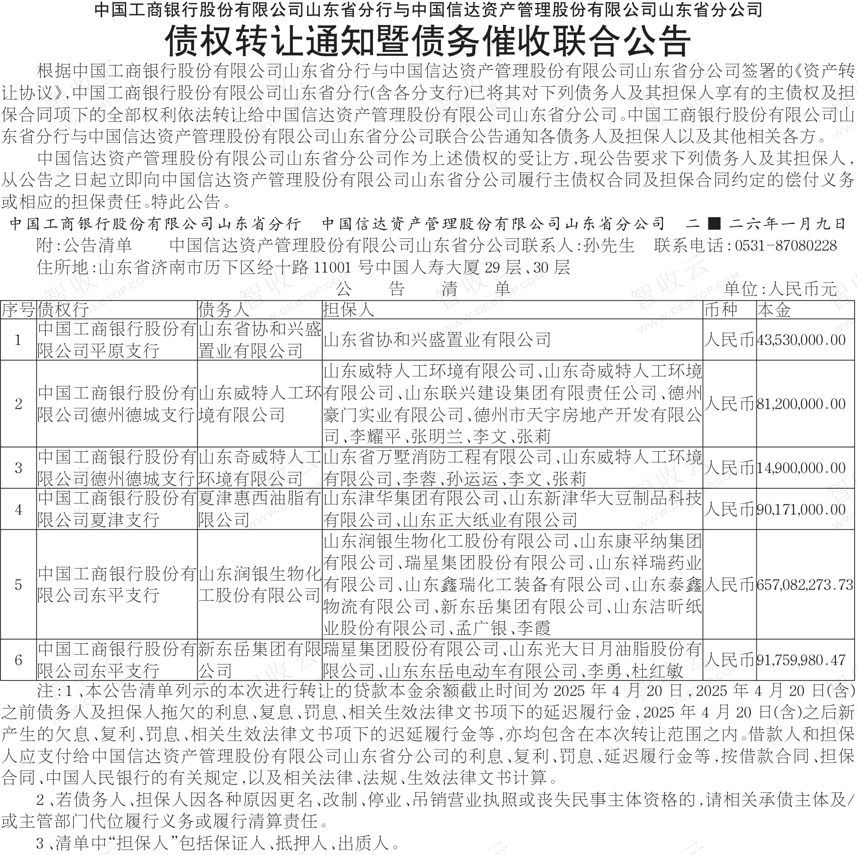 山东润银生物化工股份有限公司,新东岳集团有限公司,中国工商银行股份有限公司山东省分行与中国信达资产管理股份有限公司山东省分公司债权转让通知暨债务催收联合公告,公告日期:2026-01-09,转让方:中国工商银行股份有限公司山东省分行,受让方:中国信达资产管理股份有限公司山东省分公司,资产总额:97864.3万元。