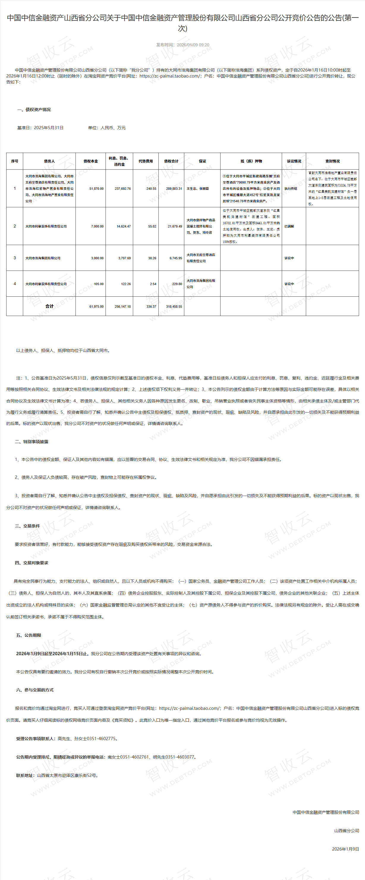 大同市浩海集团有限公司,大同市利豪装饰有限责任公司,中国中信金融资产山西省分公司关于中国中信金融资产管理股份有限公司山西省分公司公开竞价公告的公告(第一次),公告日期:2026-01-09,债权方:中国中信金融资产管理股份有限公司山西省分公司,资产总额:318458.6万元。