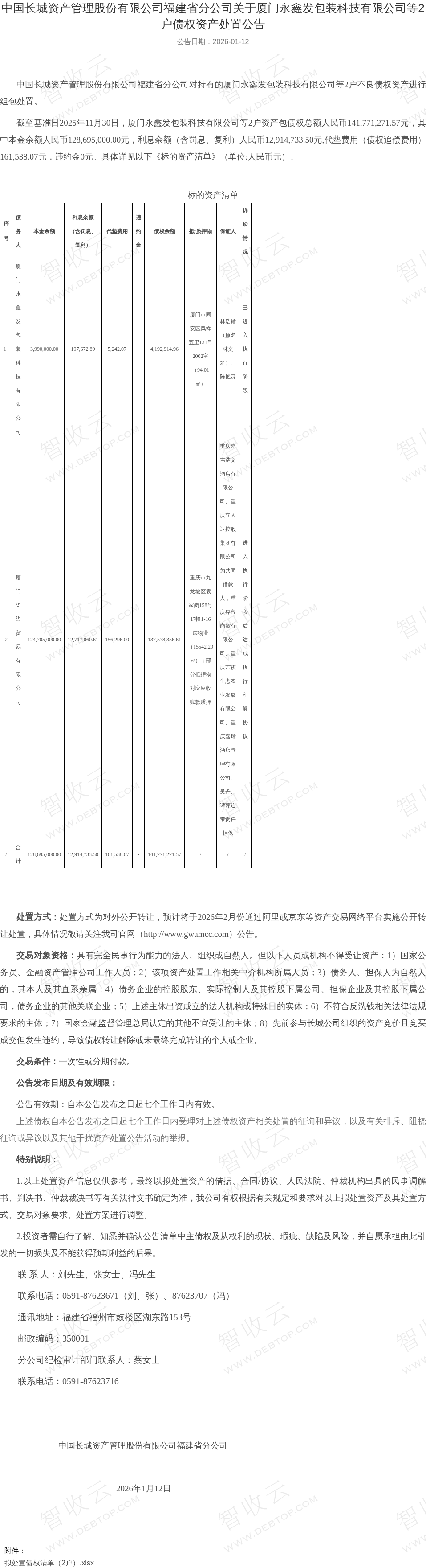 中国长城资产管理股份有限公司福建省分公司关于厦门永鑫发包装科技有限公司等2户债权资产处置公告