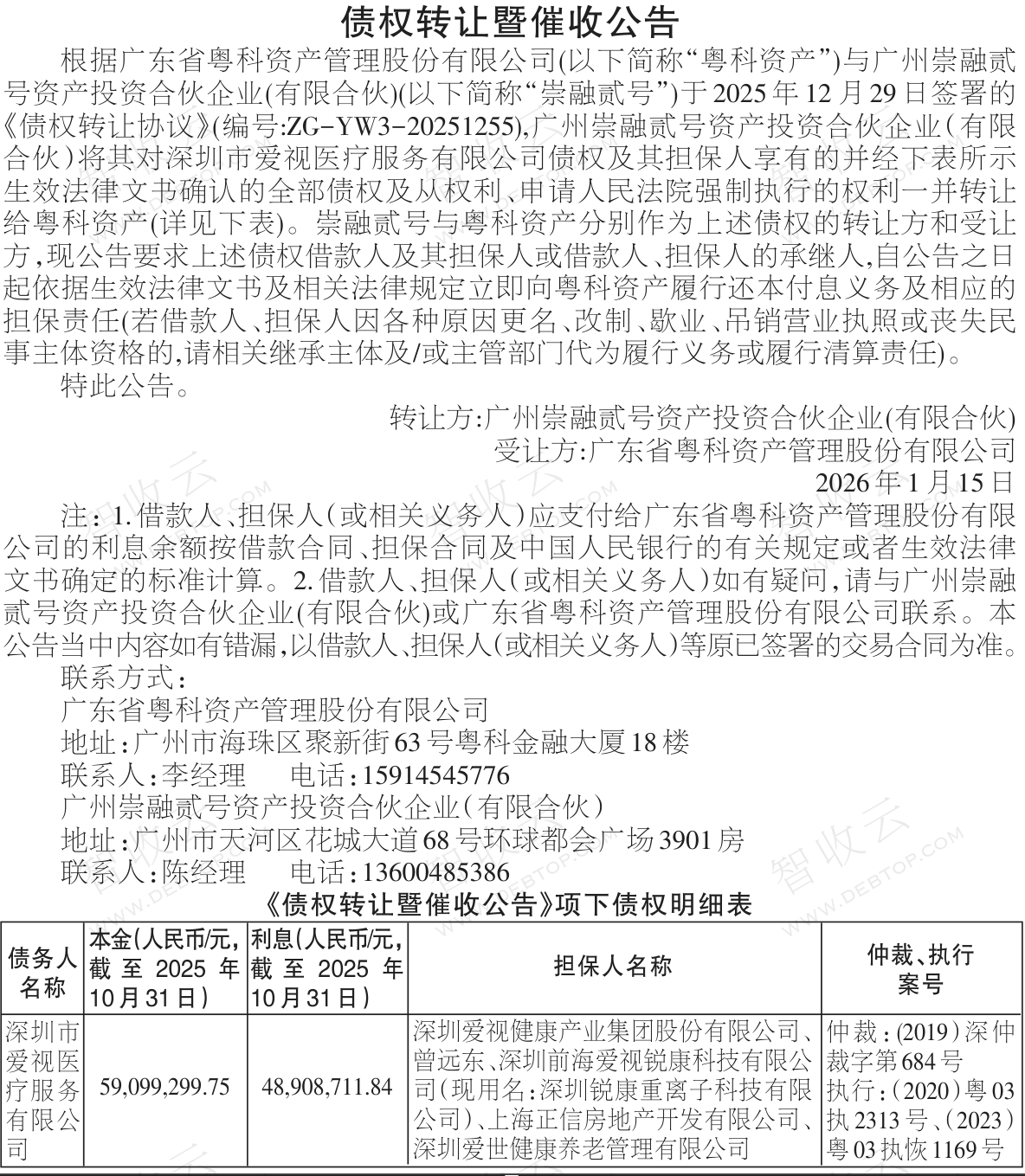 深圳市爱视医疗服务有限公司,深圳爱视健康产业集团股份有限公司,债权转让暨催收公告,公告日期:2026-01-15,转让方:广州崇融贰号资产投资合伙企业(有限合伙),受让方:广东省粤科资产管理股份有限公司,资产总额:10800.8万元。