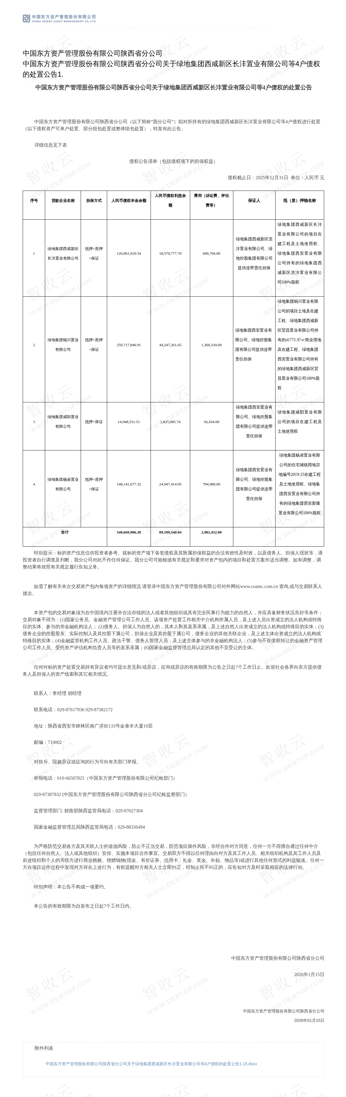 中国东方资产管理股份有限公司陕西省分公司关于绿地集团西咸新区长沣置业有限公司等4户债权的处置公告1.