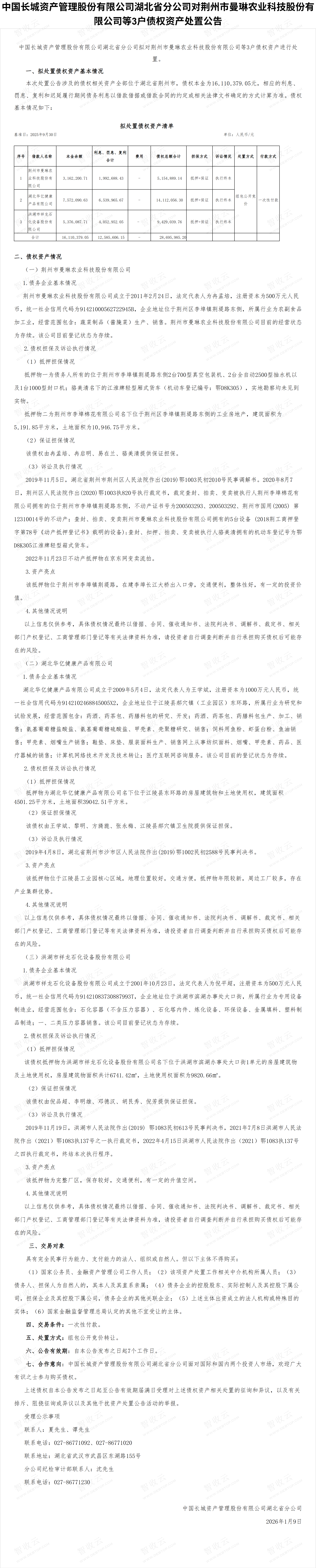 中国长城资产管理股份有限公司湖北省分公司对荆州市曼琳农业科技股份有限公司等3户债权资产处置公告