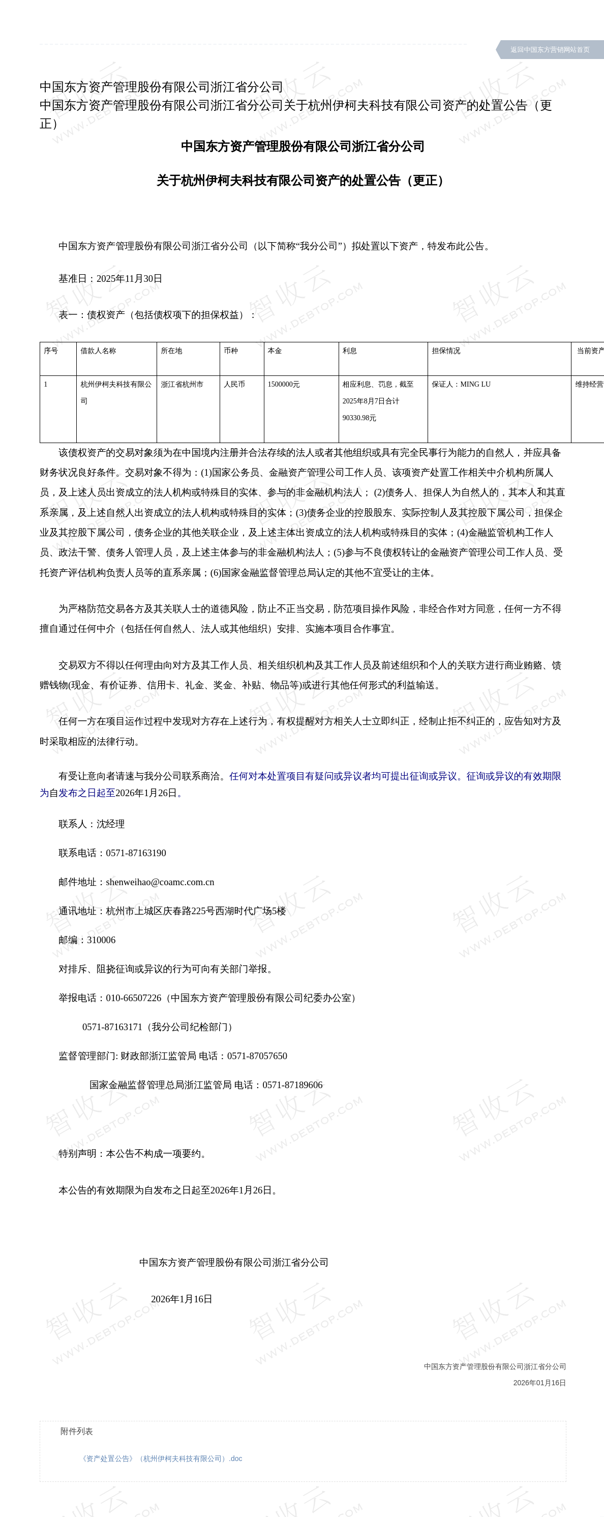 杭州伊柯夫科技有限公司中国东方资产管理股份有限公司浙江省分公司关于杭州伊柯夫科技有限公司资产的处置公告(更正) 补充公告