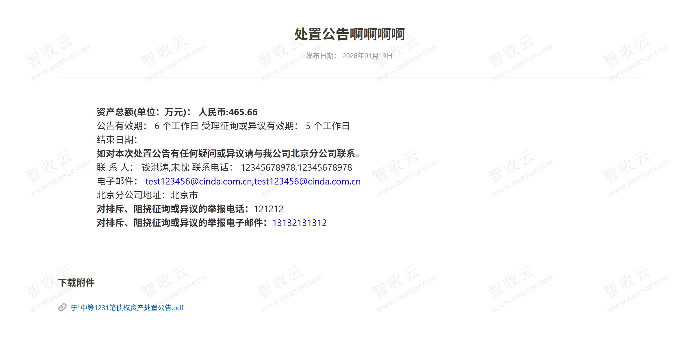 ,处置公告啊啊啊啊,公告日期:2026-01-19,债权方:中国信达资产管理股份有限公司北京分公司,资产总额:465.7万元。