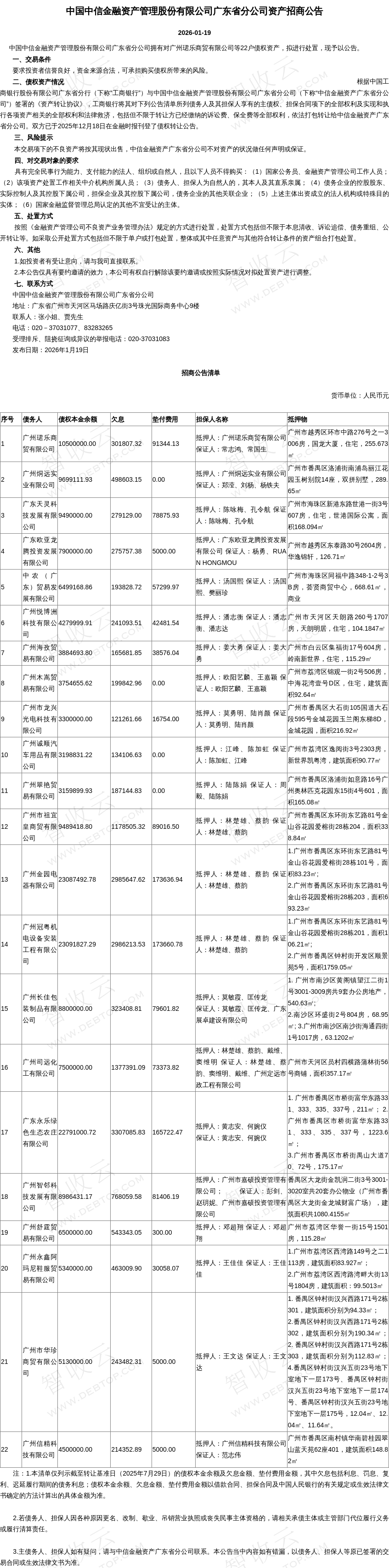广州珺乐商贸有限公司,广州烔远实业有限公司,中国中信金融资产管理股份有限公司广东省分公司资产招商公告,公告日期:2026-01-19,债权方:中国中信金融资产管理股份有限公司广东省分公司,资产总额:20907.8万元。