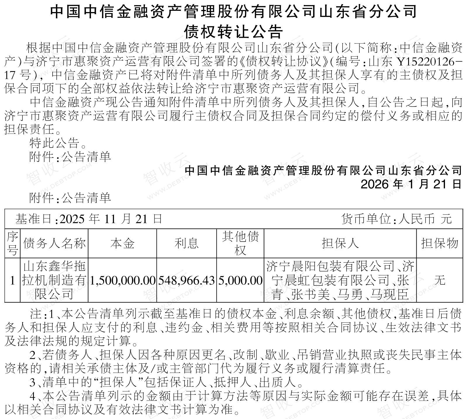 山东鑫华拖拉机制造有限公司,济宁晨虹包装有限公司,中国中信金融资产管理股份有限公司山东省分公司债权转让公告,公告日期:2026-01-21,转让方:中国中信金融资产管理股份有限公司山东省分公司,受让方:济宁市惠聚资产运营有限公司,资产总额:205.4万元。