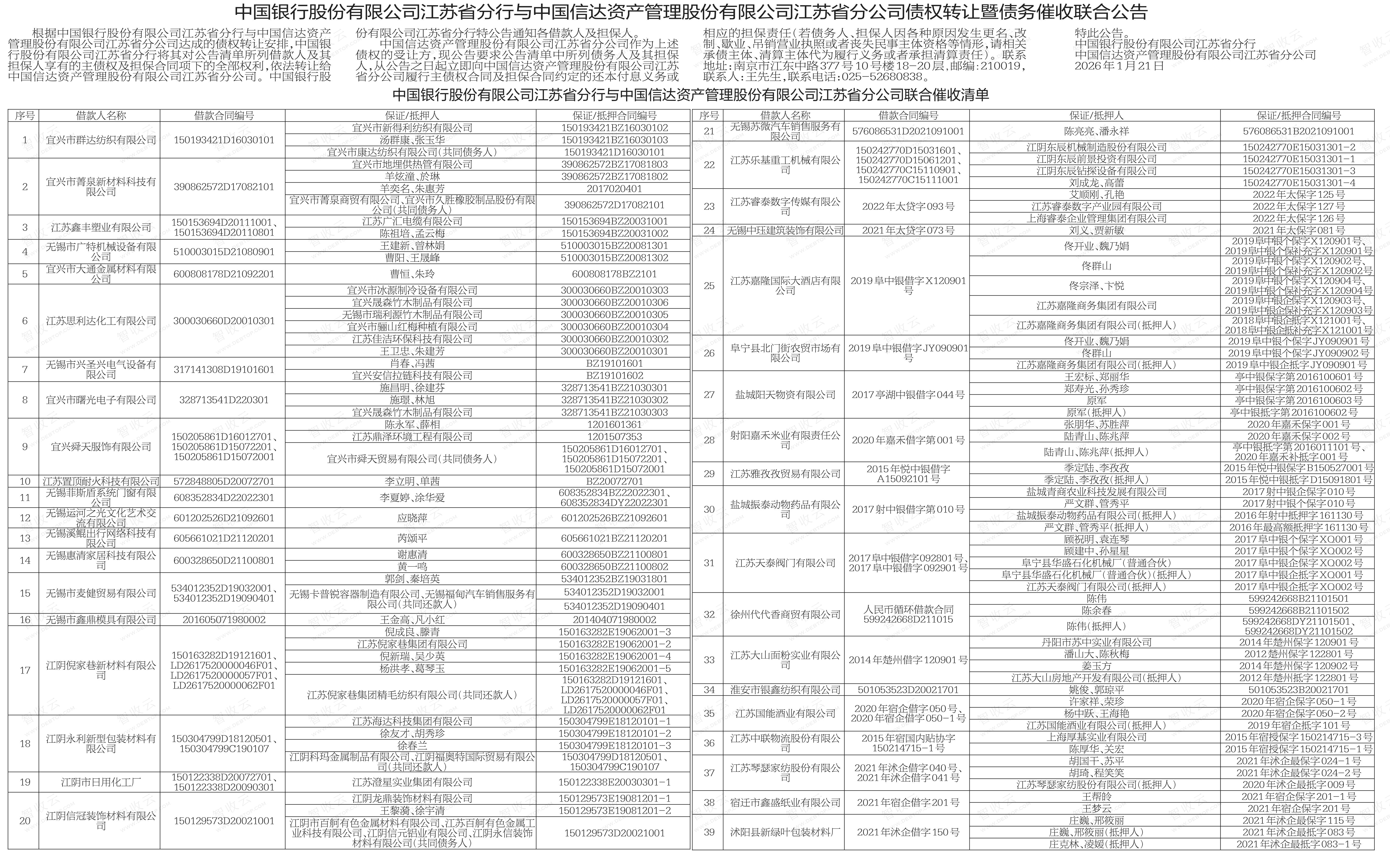 江阴永利新型包装材料有限公司,江阴倪家巷新材料有限公司,中国银行股份有限公司江苏省分行与中国信达资产管理股份有限公司江苏省分公司债权转让暨债务催收联合公告,公告日期:2026-01-21,转让方:中国银行股份有限公司江苏省分行,受让方:中国信达资产管理股份有限公司江苏省分公司,资产总额:0.0万元。