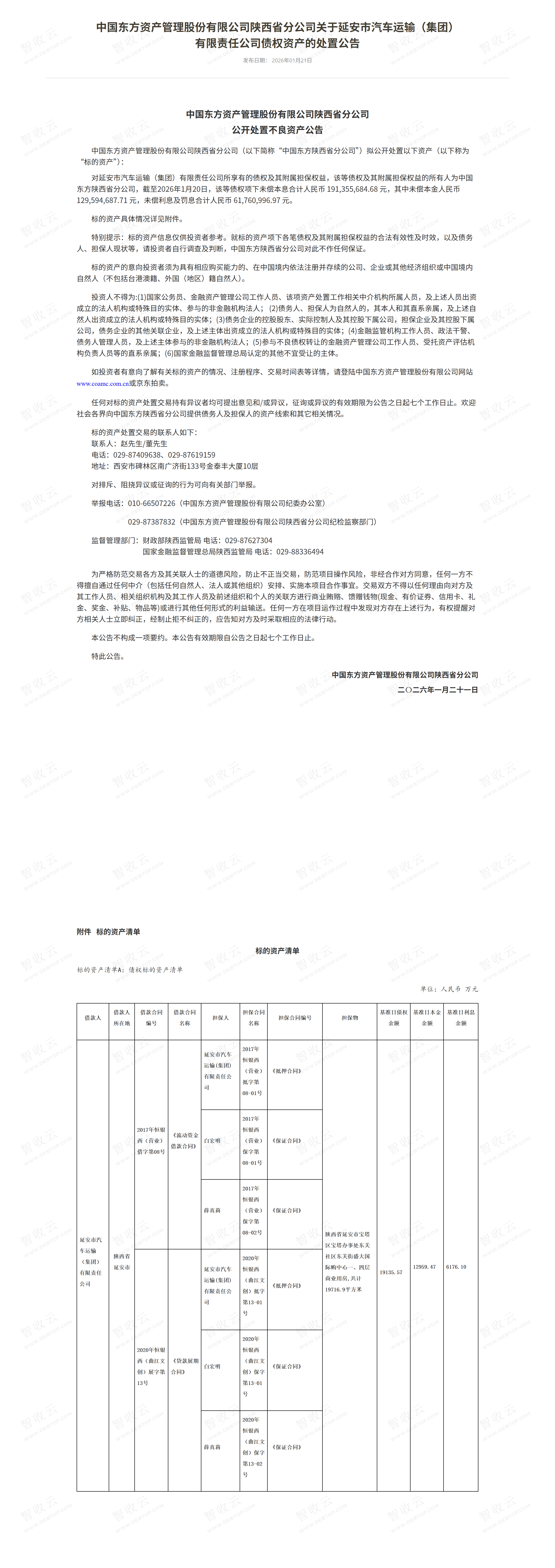 延安市汽车运输(集团)有限责任公司,中国东方资产管理股份有限公司陕西省分公司关于延安市汽车运输(集团)有限责任公司债权资产的处置公告,公告日期:2026-01-21,债权方:中国东方资产管理股份有限公司陕西省分公司,资产总额:19135.6万元。
