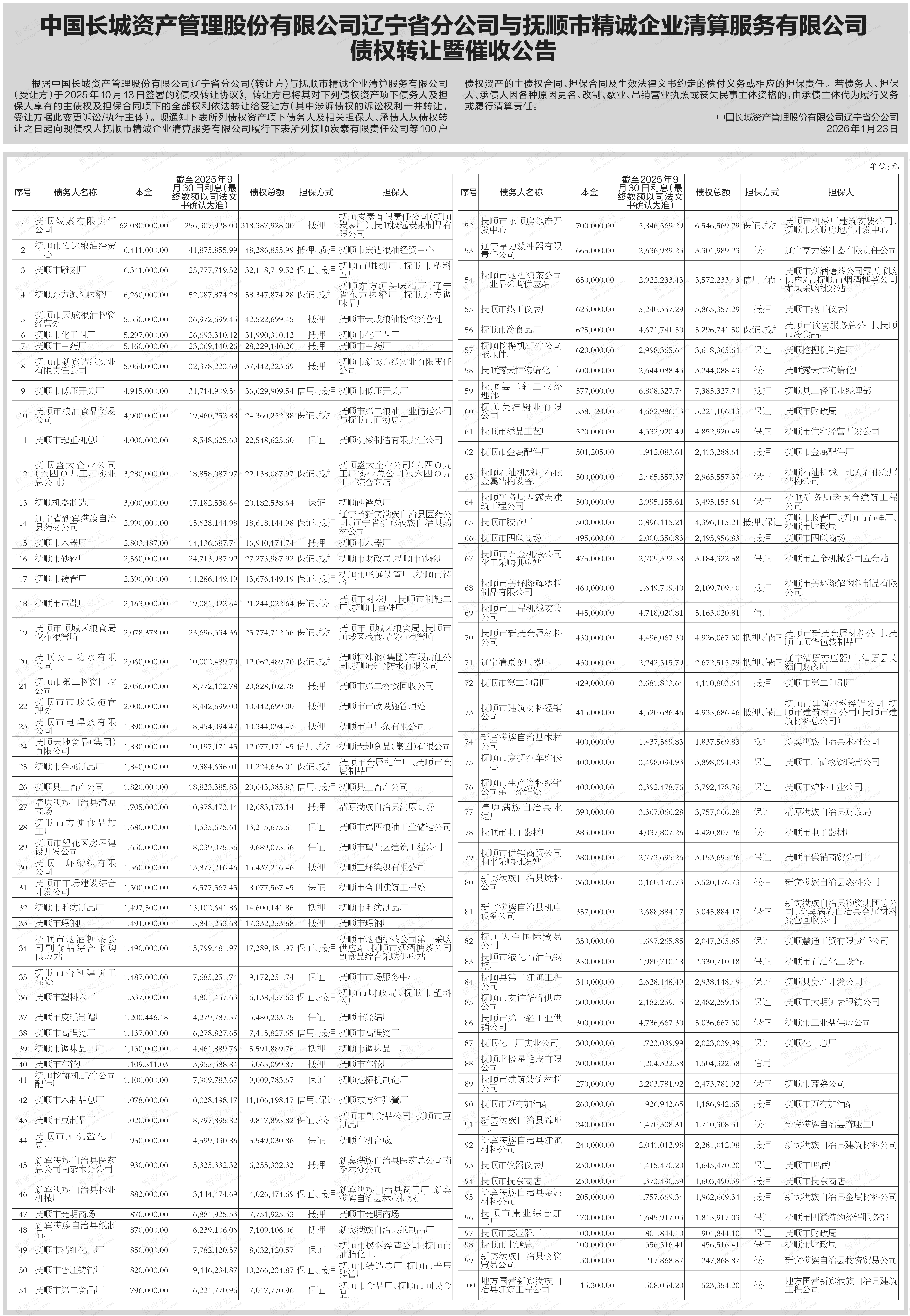 抚顺北极星毛皮有限公司,抚顺市第二印刷厂,中国长城资产管理股份有限公司辽宁省分公司与抚顺市精诚企业清算服务有限公司辽宁债权转让暨催收公告,公告日期:2026-01-23,转让方:中国长城资产管理股份有限公司辽宁省分公司,受让方:抚顺市精诚企业清算服务有限公司,资产总额:133243.5万元。