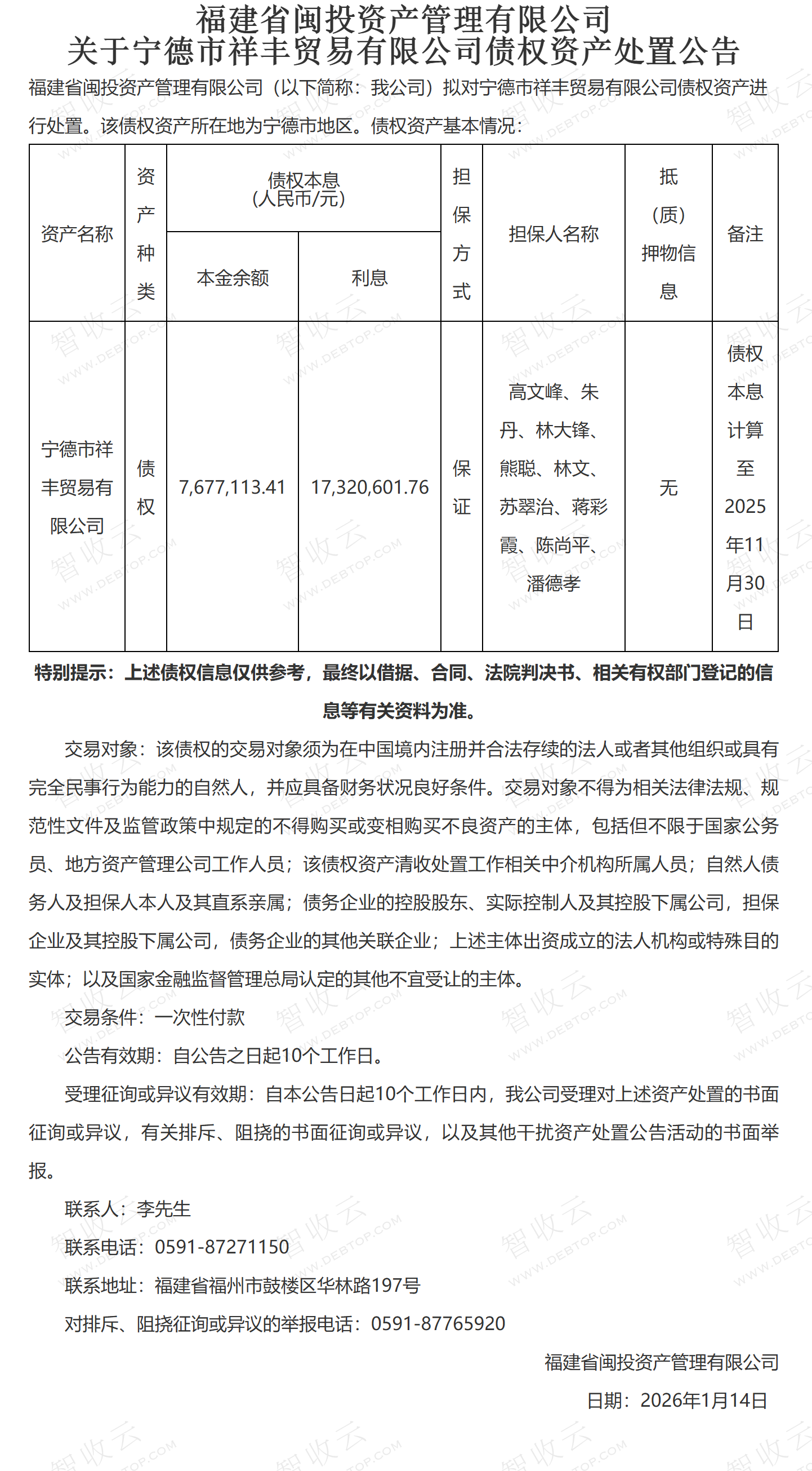 宁德市祥丰贸易有限公司,关于宁德市祥丰贸易有限公司债权资产处置公告,公告日期:2026-01-14,债权方:福建省闽投资产管理有限公司,资产总额:2499.8万元。