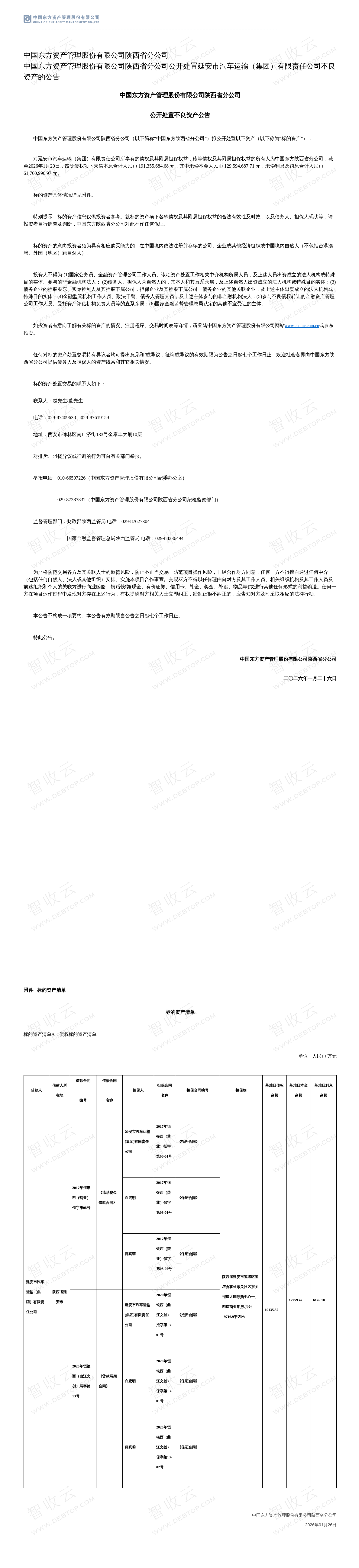 中国东方资产管理股份有限公司陕西省分公司公开处置延安市汽车运输(集团)有限责任公司不良资产的公告
