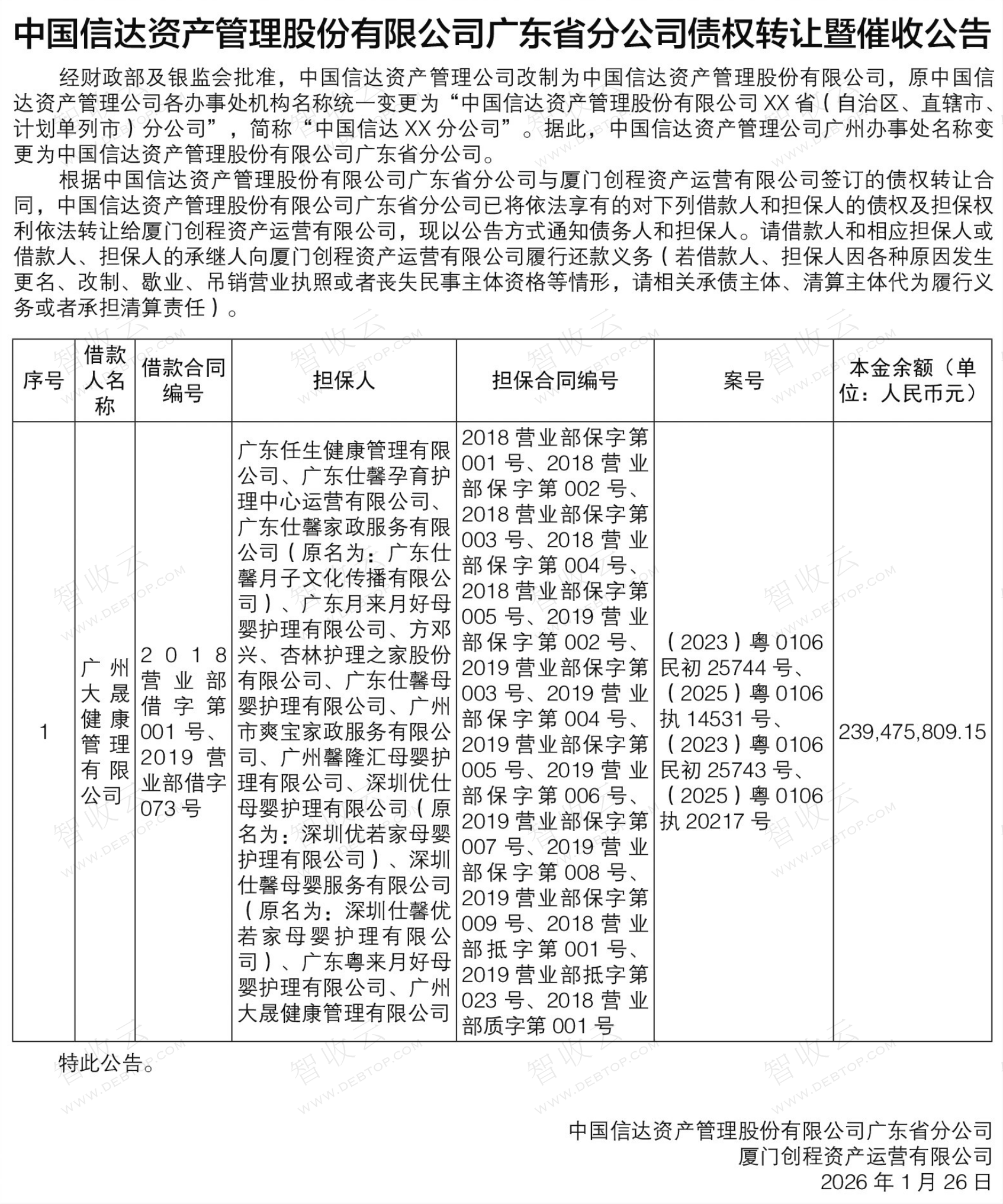广州大晟健康管理有限公司,广东月来月好母婴护理有限公司,中国信达资产管理股份有限公司广东省分公司债权转让暨催收公告,公告日期:2026-01-26,转让方:中国信达资产管理股份有限公司广东省分公司,受让方:厦门创程资产运营有限公司,资产总额:23947.6万元。