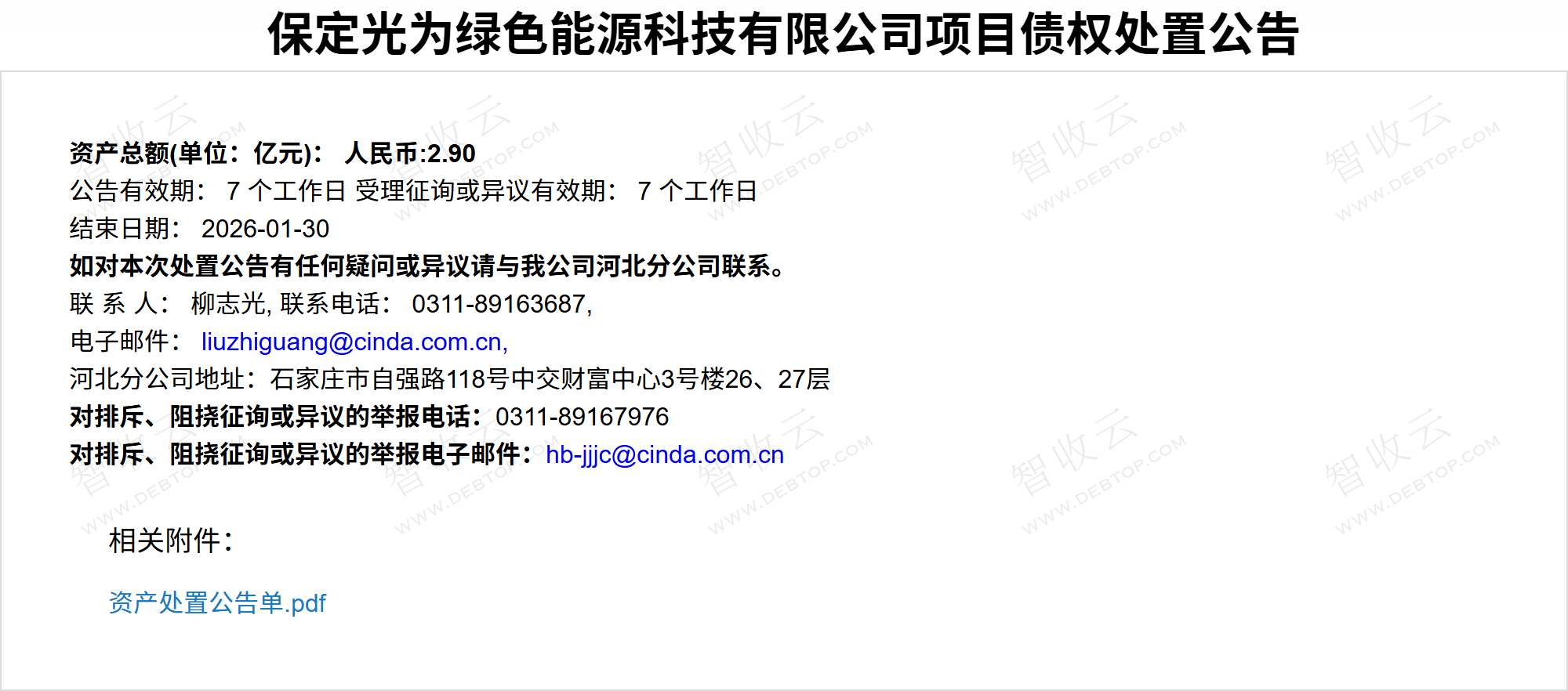 保定光为绿色能源科技有限公司项目债权处置公告