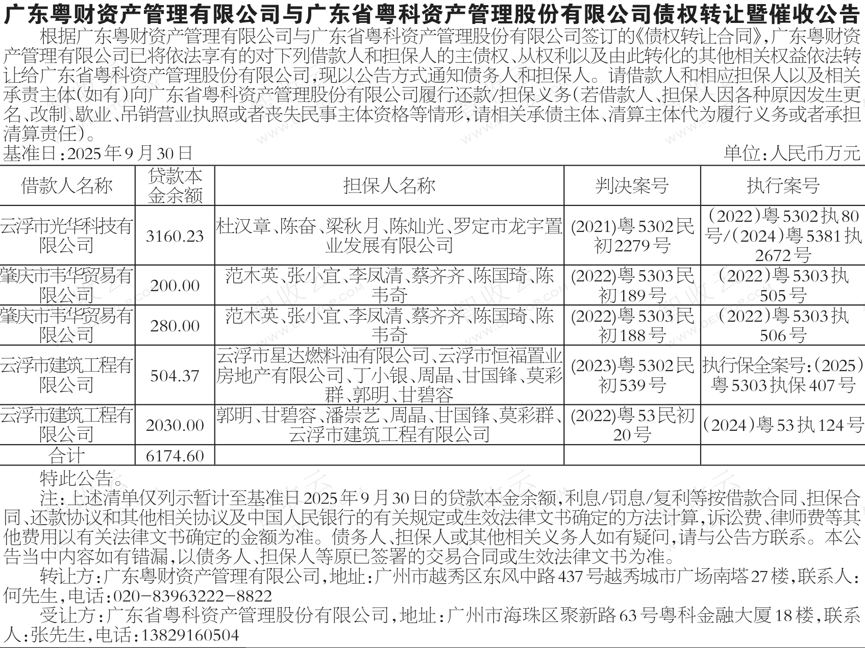 肇庆市韦华贸易有限公司,云浮市光华科技有限公司,广东粤财资产管理有限公司与广东省粤科资产管理股份有限公司债权转让暨催收公告,公告日期:2026-01-27,转让方:广东粤财资产管理有限公司,受让方:广东省粤科资产管理股份有限公司,资产总额:6174.6万元。