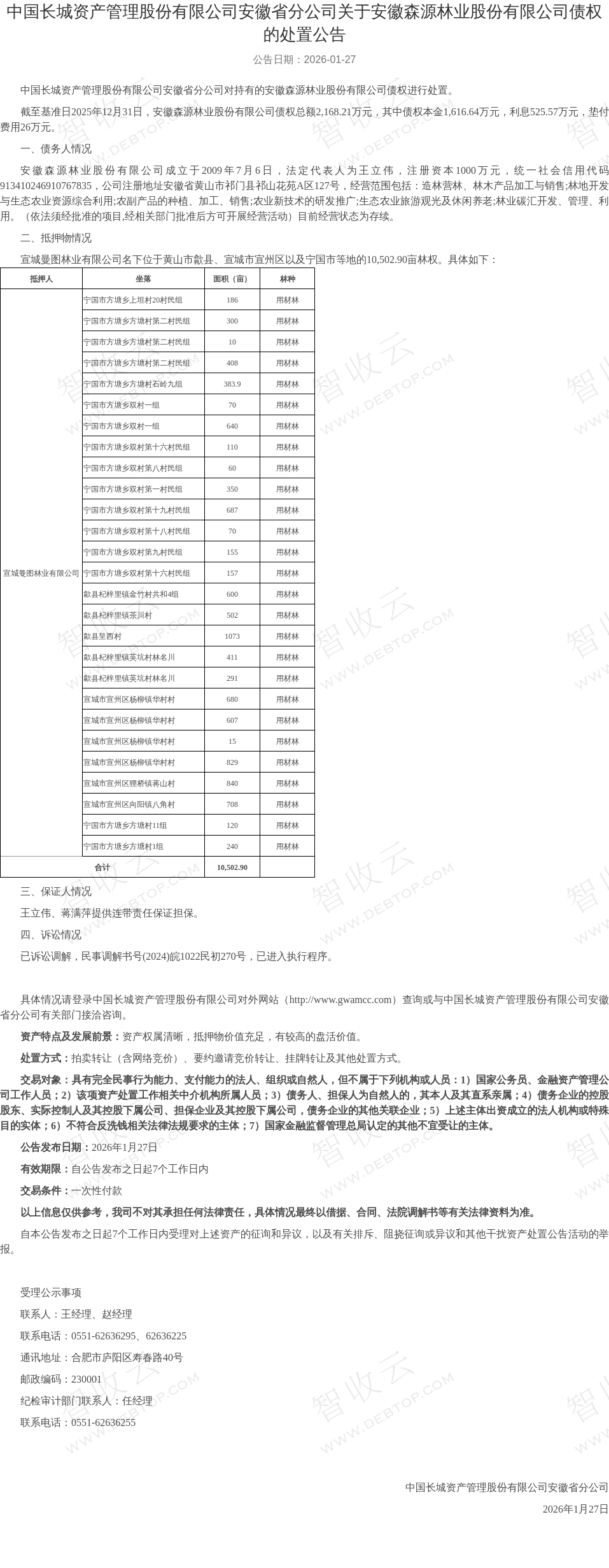 安徽森源林业股份有限公司,宣城曼图林业有限公司,中国长城资产管理股份有限公司安徽省分公司关于安徽森源林业股份有限公司债权的处置公告,公告日期:2026-01-27,债权方:中国长城资产管理股份有限公司安徽省分公司,资产总额:2168.2万元。