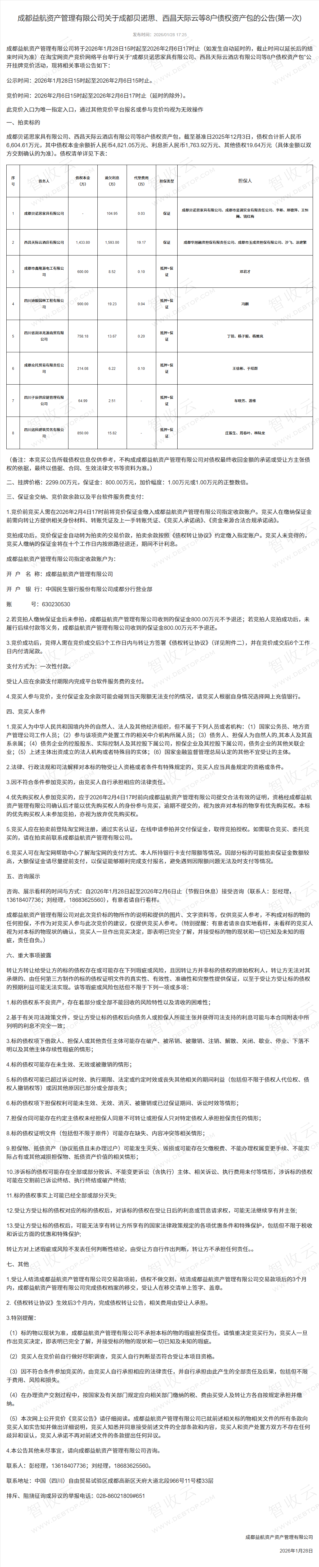 成都贝诺思家具有限公司,西昌天际云酒店有限公司,成都益航资产管理有限公司关于成都贝诺思、西昌天际云等8户债权资产包的公告(第一次),公告日期:2026-01-28,债权方:成都益航资产管理有限公司,资产总额:6604.6万元。